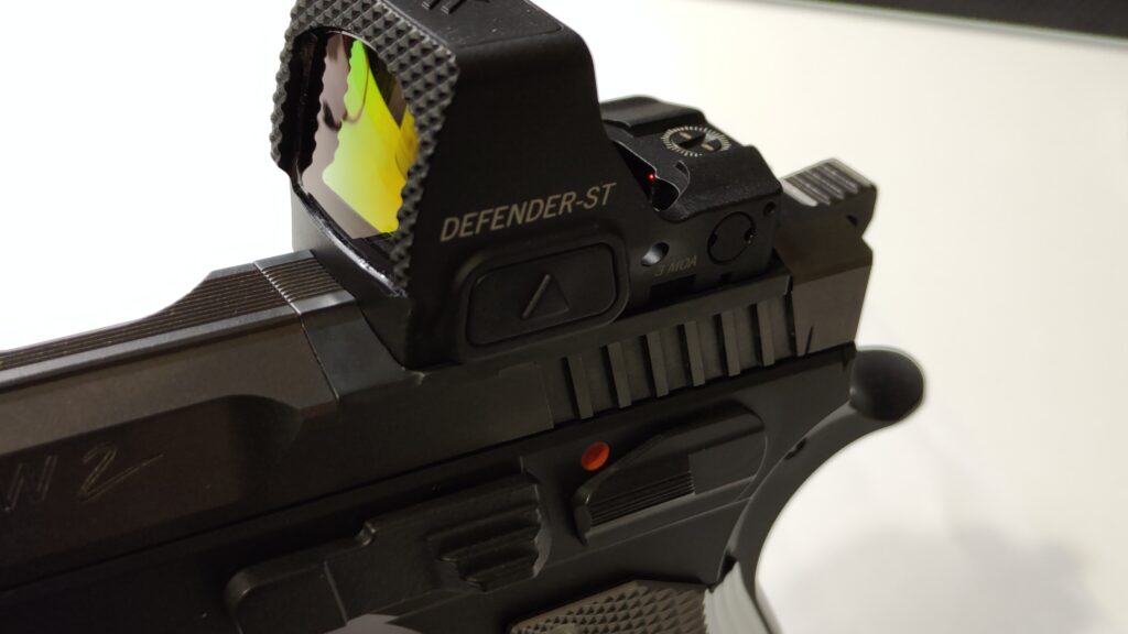 Kolimator umieszczony na Shadow 2 Or z wykorzystaniem stalowej płytki montażowej.
